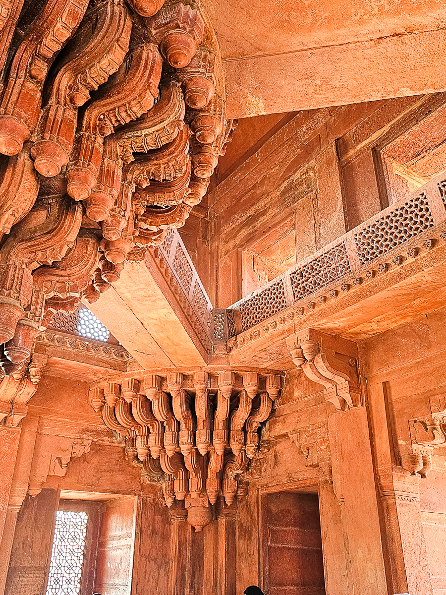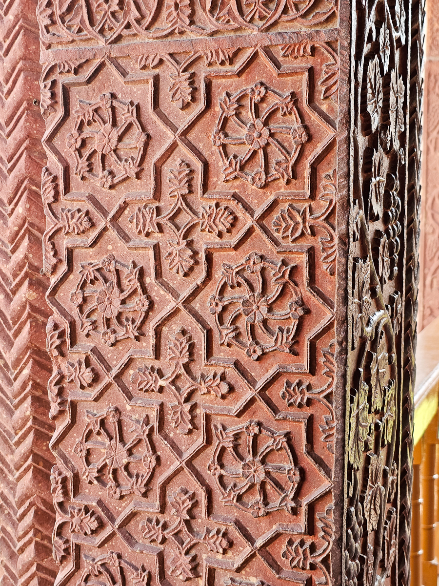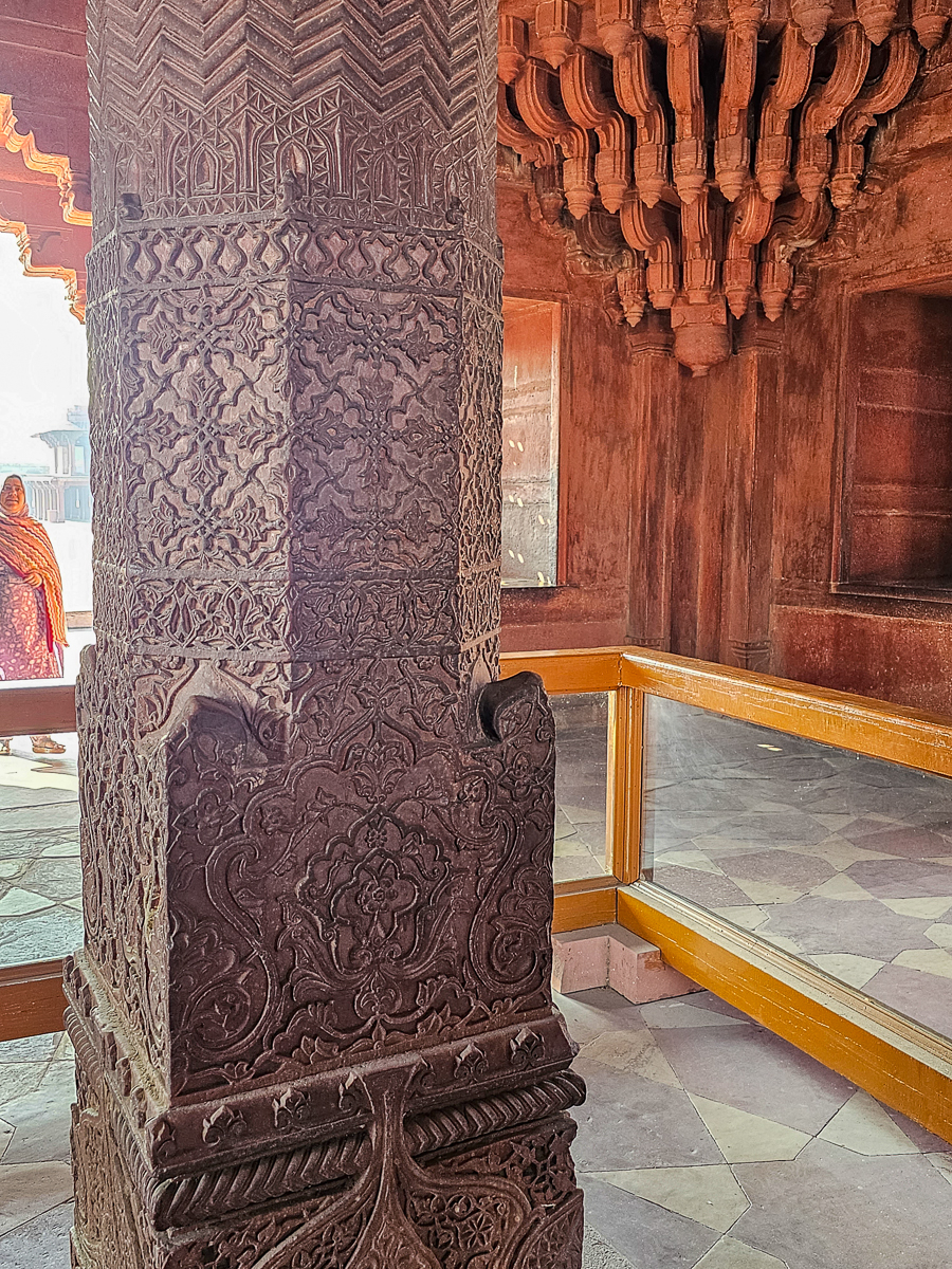 Above, three photos of the sandstone carvings inside the Fatehpur Sikri.