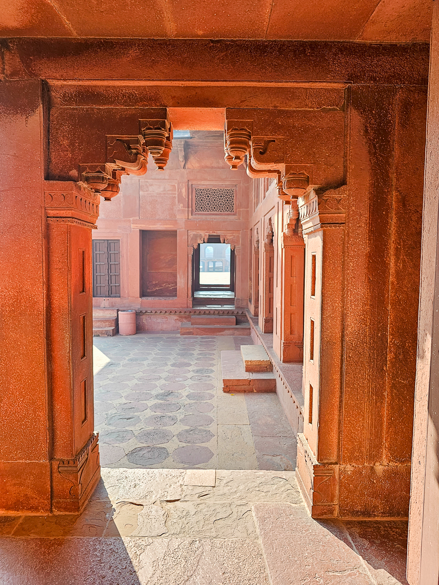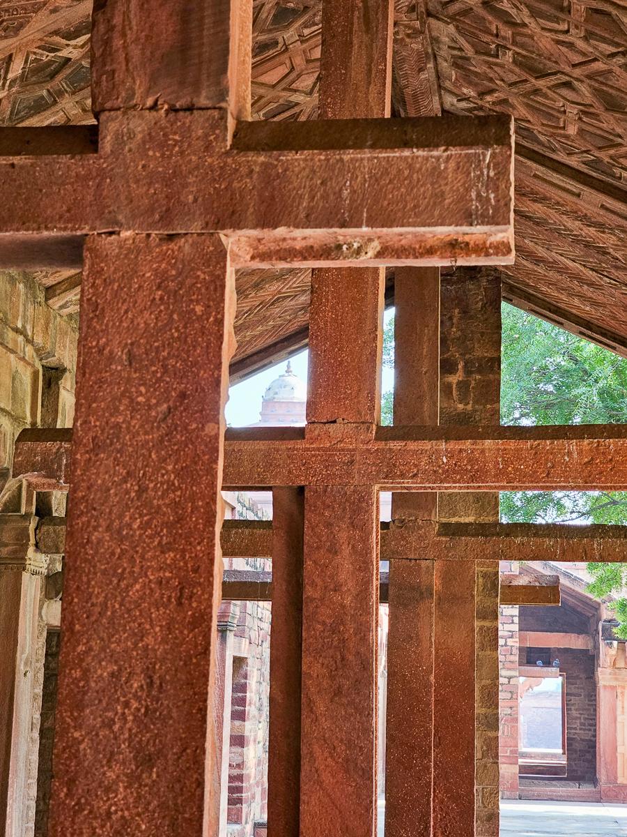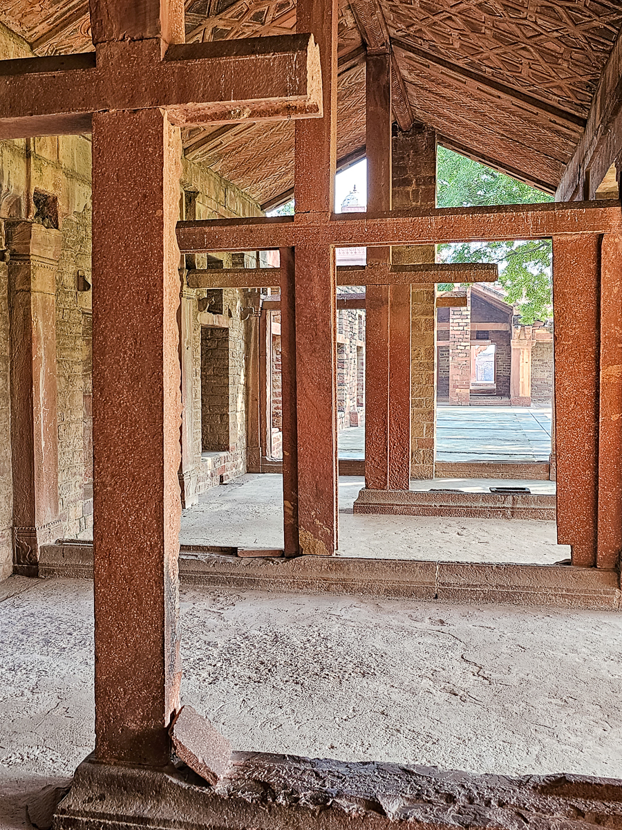 Below, I was captured by these structures, taking dozens of photos. What my eye saw was geometry, but what I captured was a long grid of red sandstone columns in a quieter residential and service wing of Fatehpur Sikri. These colonnades connected private rooms, providing shaded walkways for attendants. Their simplicity departs from the elaborate carvings seen elsewhere, such as on the central throne pillar.